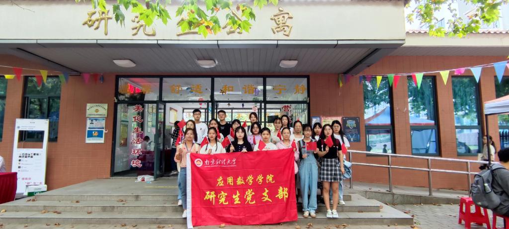 研究生党支部书记徐语童与支部党员在宿管站前合影