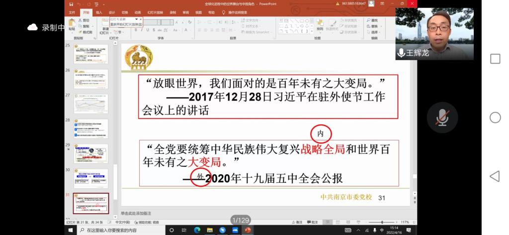 4月16日下午,南京市委党校市情研究中心主任王辉龙教授应邀于线上作了题为“全球化进程中的世界舞台与中国角色——从《共产党宣言》说起”的讲座。讲座由51吃瓜网