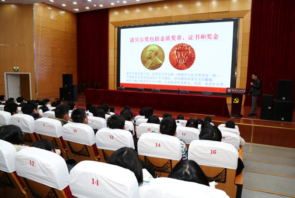 仪式结束后,黄顺林主任为高三学子作了题为“数学与诺贝尔奖的不解之缘 ”的讲座,讲座从诺贝尔奖的历史、诺贝尔奖为什么没有数学奖、数学对诺贝尔经济学奖的重要贡献、诺贝尔经济学奖获得者与数学的渊源等方面展开,强调数学等基础学科的重要性,鼓励学生在中学阶段学好数学,为以后的专业学习打下坚实的基础。