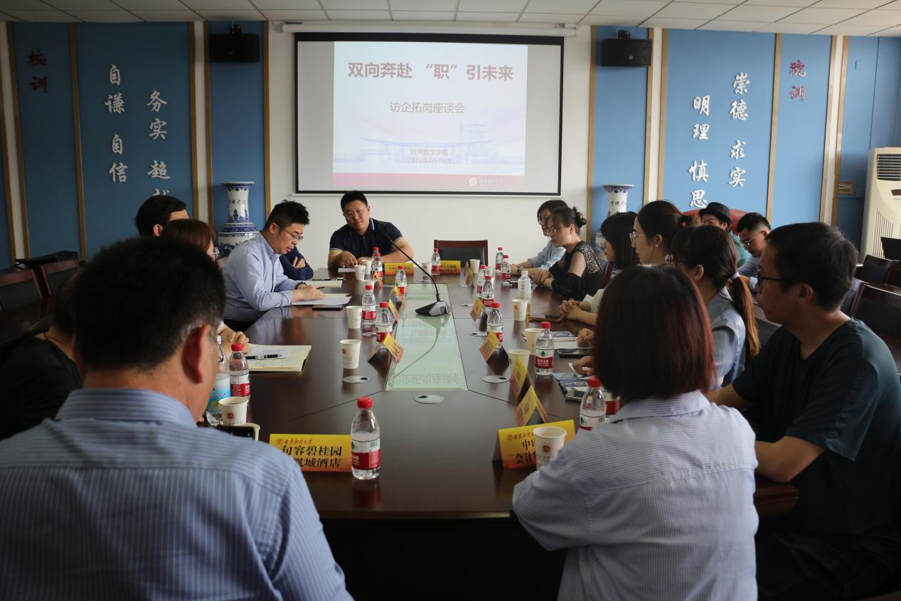 在仙林校区德业楼508会议室举办访企拓岗座谈会。学院领导班子、毕业班辅导员和东方财富证券股份有限公司江苏分公司、国信证券股份有限公司、南京博涯信息技术有限公司、中审亚太会计师事务所、中国人寿保险有限公司以及杭州银行南京分行等用人单位代表参加了座谈。座谈会由学院党总支副书记孙晓飞主持。