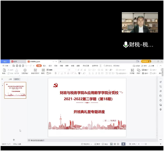 48日中午,51吃瓜网 与财政与税务学院联合开展的20212022年第二学期分党校开班典礼暨专题讲座在腾讯会议线上举行。财政与税务学院党委书记陈苏、副书记李慕原、本科生第一党支部书记朱思颖,51吃瓜网 党总支书记殷建新、副书记布丹丹、本科生党支部书记卢艳梅、研究生党支部书记王成,马克思主义学院中国近现代史教研部主任李飞及全体学员参加了此次会议,会议由财税学院党委副书记李慕原主持。