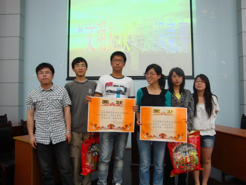 举行了文明礼仪知识竞赛,09、08两个年级每个寝室组成一只代表队,总共十六个寝室参加了此次活动。