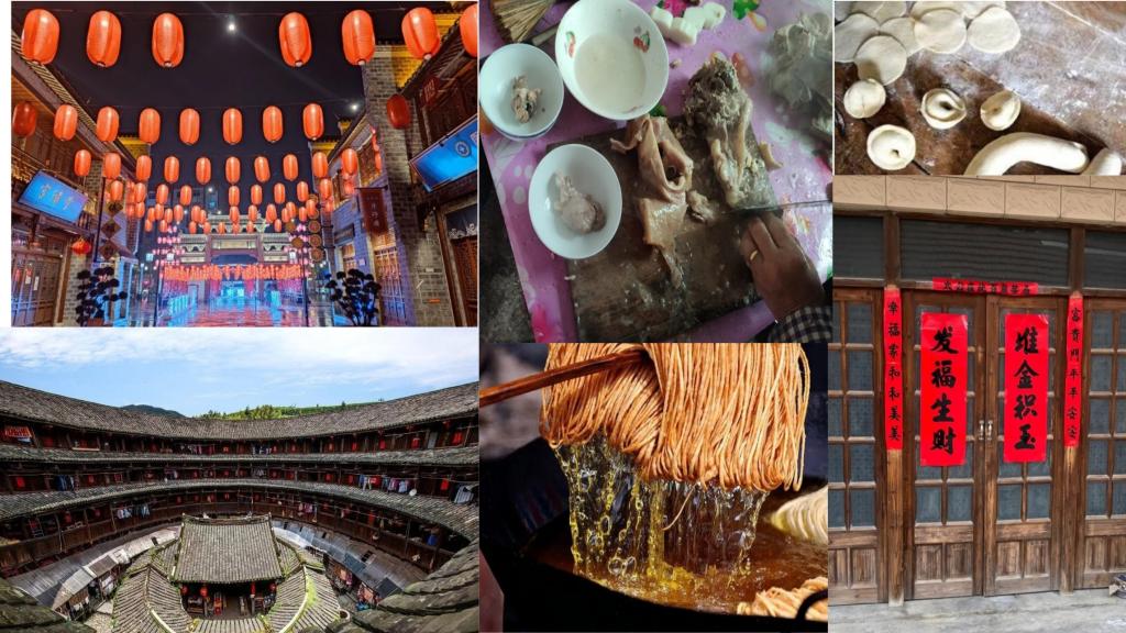 金数1902班常博宇同学介绍到,在山东,人们常在元旦吃馄饨,称为“填仓”,在黄县、蓬莱一带,春节早起要照虚耗。由女主人手持红烛,把家中各个角落照一边,意为以光明驱逐黑暗,接着将年前以面粉做成的各种窗花放在窗台上。小孩子起床后,要攀着门栓打三个秋千,据说可以长得快。在山东的一些地方,煮饺子时要用芝麻秸烧火,意味着新的一年像芝麻开花一样节节高升,饭后在锅内要放上馒头,意味着有余。金数2001班汪梦婷同学表示,在过年那天,江西人民上午都会吃砧板肉,配着年糕入食。而在数学1901班王静怡同学的故乡安徽,过年时老人们会“炸馓子”。制作馓子要用上好的面料揉成面坯,然后扬面、切条,再搓成条状,放入油锅便可炸出新鲜的馓子。在福建,据金数1901班蔡双杰同学介绍,从小年开始,福建南靖土楼便张灯结彩营造土楼人家过年吉祥、喜庆的气氛,春节期间还会举办土楼年夜饭、放烟花等极具土楼特色的民俗活动……