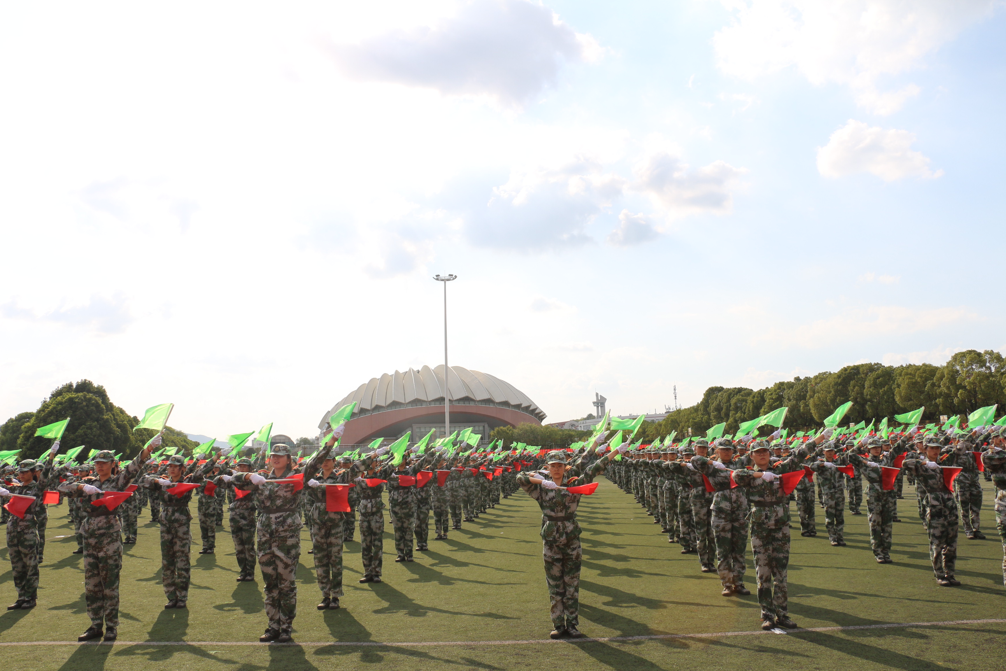 的新生参演的项目为旗语和长棍术。在激情澎湃的背景音乐中,同学们利落地起立蹲下,整齐地举起双手,摆出了“1949”、“2019”、“1956”、“70”、“中国”、“南财”等几个饱含深情的数字和词语,并用红绿双旗传递出“我爱你中国”和“我爱南财”两句简短而深厚的话语。随后是长棍术表演。新生们紧握手中长棍,动作到位,气势如虹。有条不紊的表演展现了新生昂扬向上的斗志。最后,南财4004名19级新生在草地上摆出了“我爱你中国”五个大字,表达了对中华人民共和国成立七十周年的祝福与对大学生活的向往。