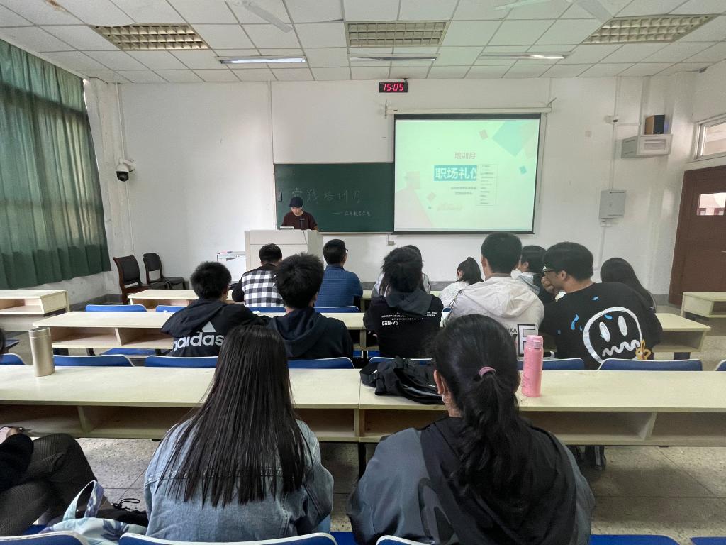 蔡双杰负责人向大家介绍了职场礼仪。他先后介绍了握手礼仪、交谈礼仪、仪容礼仪、举止礼仪、电话礼仪和电梯礼仪。期间,赵凯奕等同学上台为大家展示基本礼仪,如打领带、握手、坐姿等。他们优秀的表现赢得了同学们的一致赞赏和掌声。随后,蔡双杰负责人与学生会部分志愿者又对各项礼仪进行了交流讨论。同学们纷纷表示以后要做一个懂礼仪的青年人。