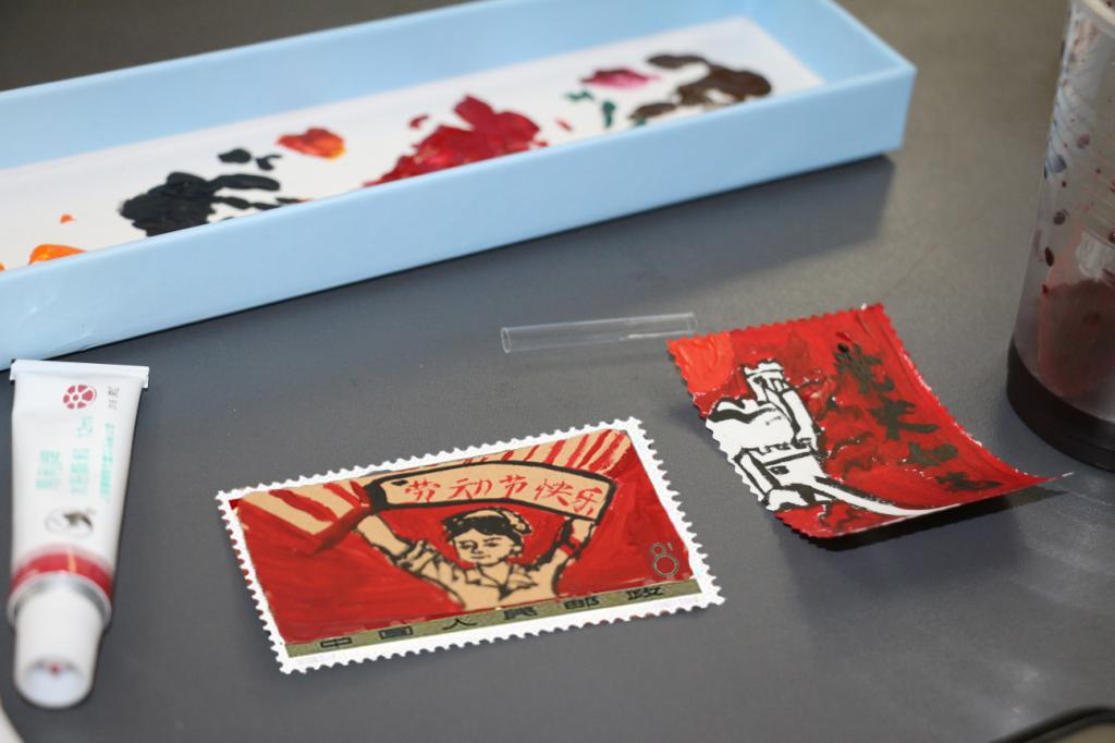 新中国成立以来,我国共发行了4套9枚劳动节专题纪念邮票,方寸之间谱写了一曲曲劳动赞歌。而现在,在组织者的安排下,活动参与者们纷纷手执画笔,亦或两两合作,以最简单的颜料和卡片,设计出一枚枚有其独特主题和相应文字释义的“五一”劳动节邮票。有这样一张邮票,它以深红色为背景,红色不仅象征着中国共产党,更是热烈而蓬发的劳动者的工作精神。画面中淳朴的劳动者高举“劳动最光荣”的旗帜,更传达了一种积极向上的劳动精神。在挑选制作的过程中,一位志愿者不禁想起历史上的劳动者申纪兰,给大家讲述起了她的故事——申纪兰是妇女代表、全国优秀共产党员,她动员妇女参加集体生产劳动,在新中国农村发展史上留下了浓墨重彩的一笔。透过这位同学的话语,同学们仿佛跨越了历史长河与那些淳朴的劳动者们建立了一种情感共鸣,进行了一次意义深远的精神对话。