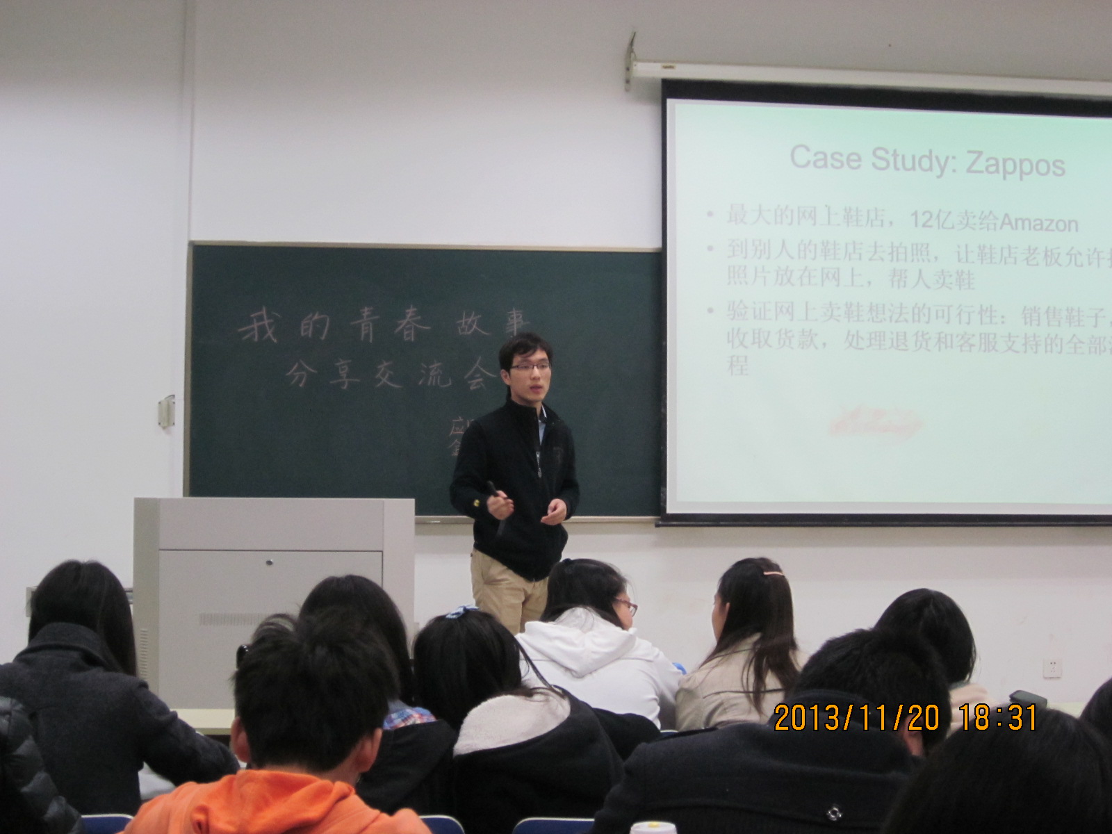 首先,蒋意殊学长为同学们讲述了他的创业之路。第一次尝试——送外卖,与其他学校的同学共同创办了91吃饭网,并对此网站进行了大量的宣传。虽然这次创业以失败告终,但这也成为了他的宝贵的经验。第二次尝试——水果电商(掌上厨娘),与学校社团合作外场,为“掌上厨娘”扩大宣传。“掌上厨娘”被越来越多的人所熟知,收到的订单也越来越多。他告诉同学们:“创业其实并不神秘,并不遥远,想验证什么就去做什么。”