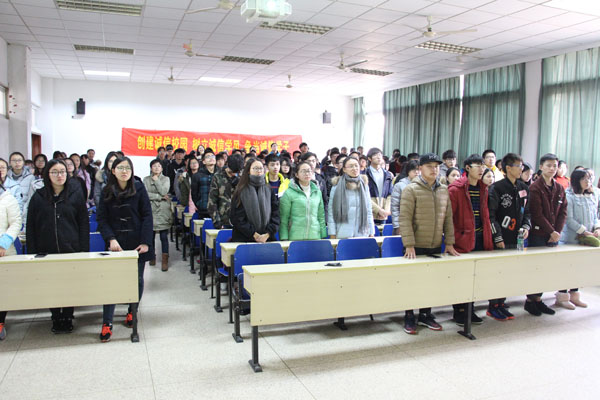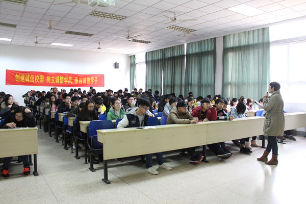在理工学科楼103教室召开诚信考试教育动员大会。学院党总支副书记张杰、分团委书记张文文,辅导员卢艳梅及2016级全体新生参加。