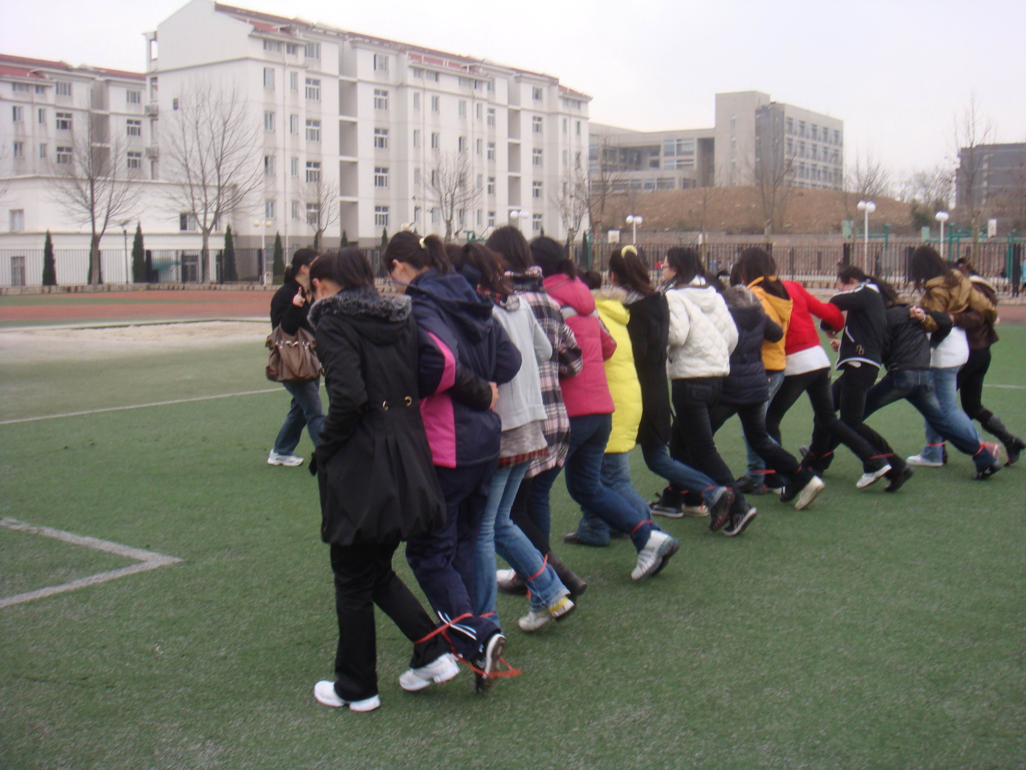 活动到此时,正式比赛已经告一段落,但大家似乎还没玩尽兴。一开始是两组并在一起,四人一组走的有点磕磕碰碰,但走了一段后就好了很多。紧接着,四人变成了五人,队伍不断的扩大着。玩到最后,所有人的脚都绑在了一起,形成了一条笔直的线。大家同心合力,一步一步地迈向前方。队伍中的人们手挽着手,肩并肩,一同喊着口号,迈着整齐的步子,走向前方的终点。我似乎觉得这个活动让我们更团结的凝聚在一起,大家相互合作,共同奔赴同一个目标。寒风依旧在吹着,但似乎是被我们的热情征服了,没有一开始那么强硬了。