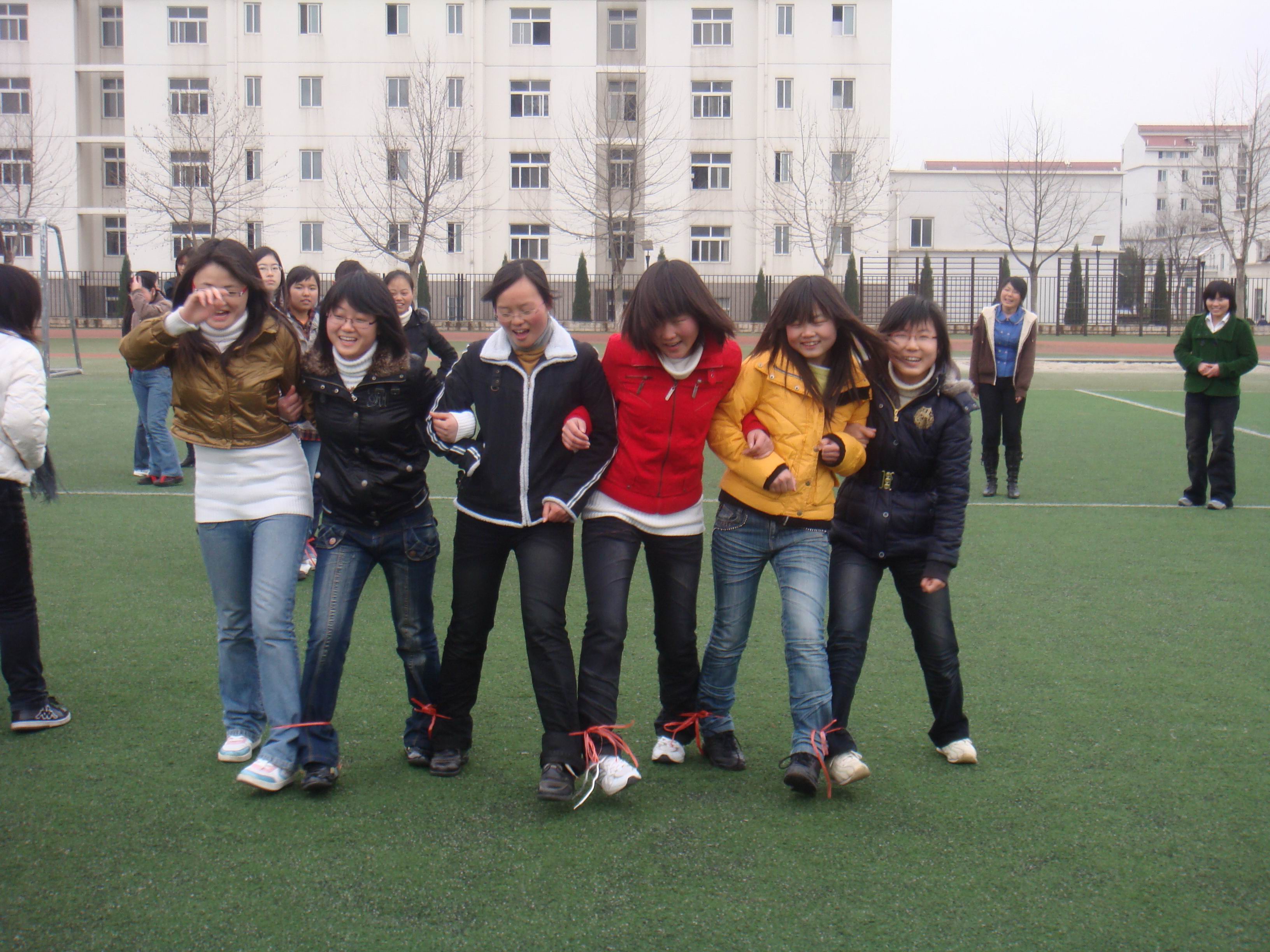 为了迎接三八妇女节,我们学生会女生部想出了一个更好玩的游戏来代替它——两人三足跑。虽说大家已经玩过很多次了,但毕竟平时很少聚在一起,理所当然的,默契少了点。不过,经过这次活动后,情况或许会改变点。