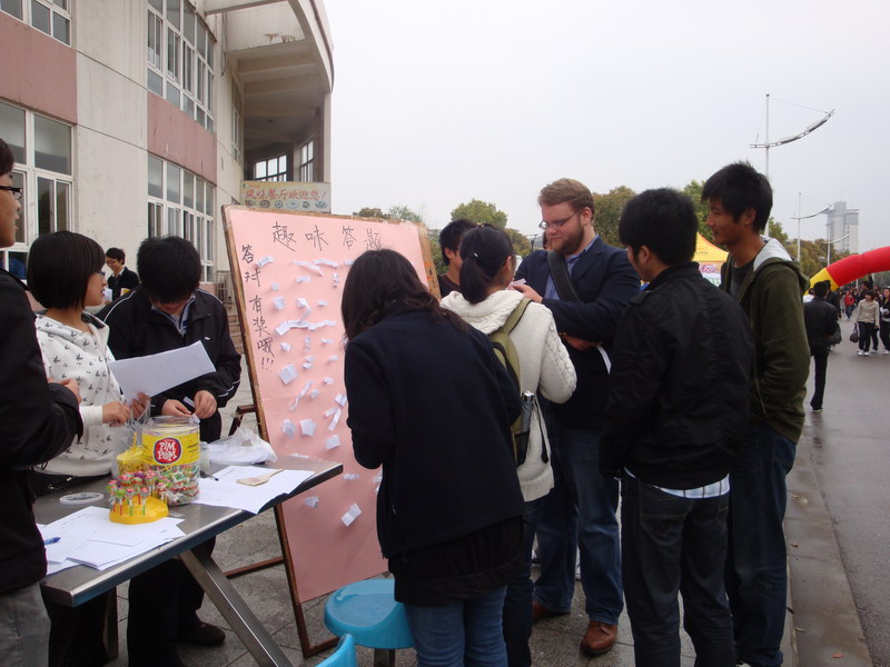 首先开展的是趣味答题。一块展板,n多写着题目的纸条,奖品“真知棒”,虽说规模不大,奖品不丰厚,但趣味数学本身的魅力却也成功的钓足了同学们的“味口”,引来很多同学驻足观看,有些蹙着额头在算着什么,有些两两的讨论着,有些甚至拿起手机开始百度搜索。可能是看到同学们都来看,连外教也来凑凑热闹。虽然不是太懂中文,经过工作人员的翻译,外教却也答出了题目,赢得了奖品,心满意足的露出了笑脸。趣味数学题一反数学的枯燥,展示了数学趣味性的一面。
