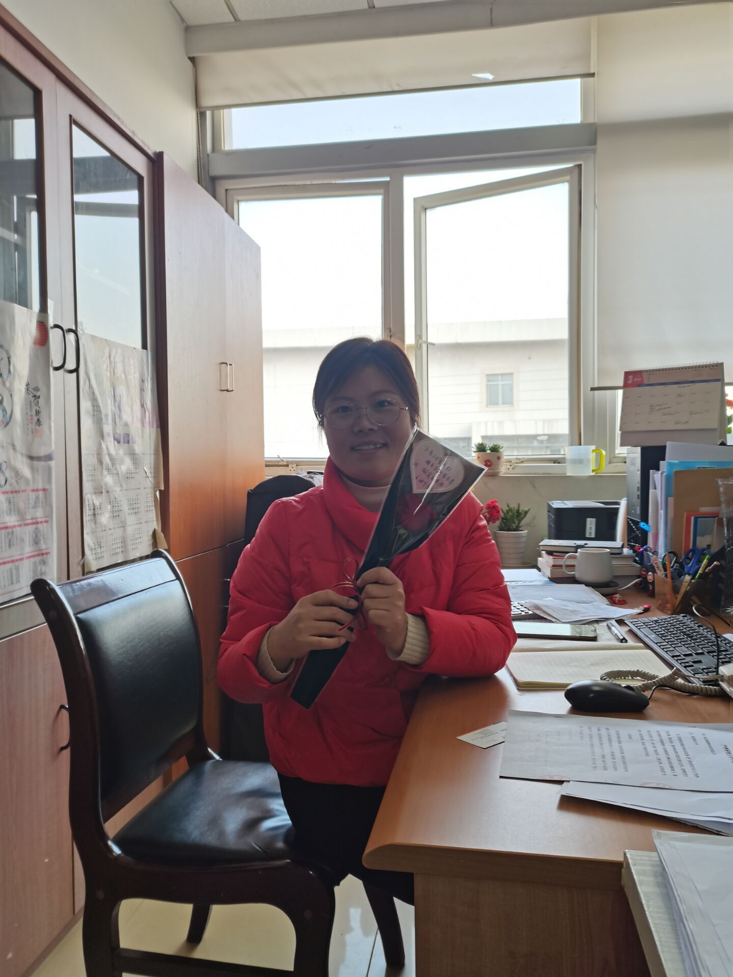 娇艳欲滴的玫瑰花被一层轻薄的白纱小心翼翼地包裹着,一圈红黄相间的细丝带系于下端。花束虽然小巧,却别致精美,这是同学们为老师们细心装扮的“一朵朵鲜花”。和鲜花在一起的还有一张张饱含着学生心意的粉红色贺卡,象征着同学对老师们的最纯粹、最美好的祝愿。当同学们将一朵朵准备好的的玫瑰花送到每位女老师手中时,老师们的脸上纷纷绽开了欣慰的笑容,她们有的亲切地拥抱了献花的同学,有的和同学们深切攀谈,有的和同学们合影留念…盛开的鲜花和灿烂的笑脸交相辉映,这是同学们认为的老师们最美的样子。
