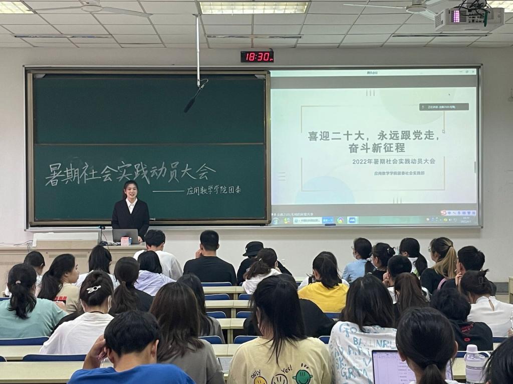 团委在仙林校区德业楼118教室举办了以“喜迎二十大,永远跟党走,奋斗新征程”为主题的暑期社会实践动员大会,大一大二全体学生参加了大会。