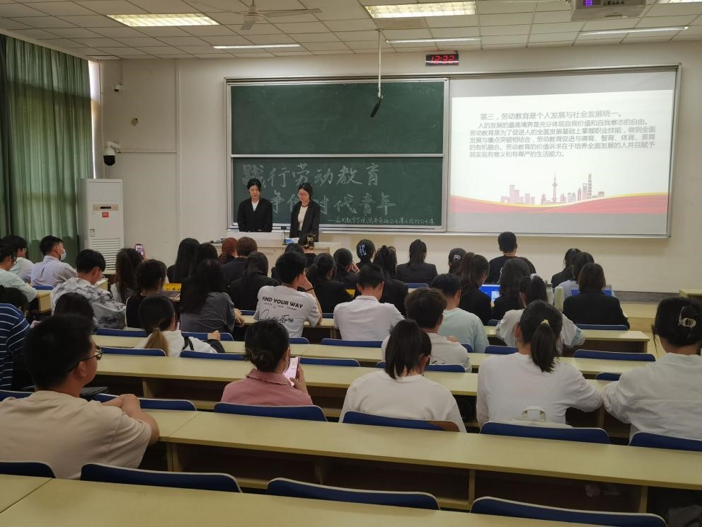在仙林校区德业楼117教室举办“践行劳动教育,争做时代青年”信仰公开课暨党的二十大精神主题宣讲,院团委青志部部员李思宇和薛如昕主持,院团委全体成员参加