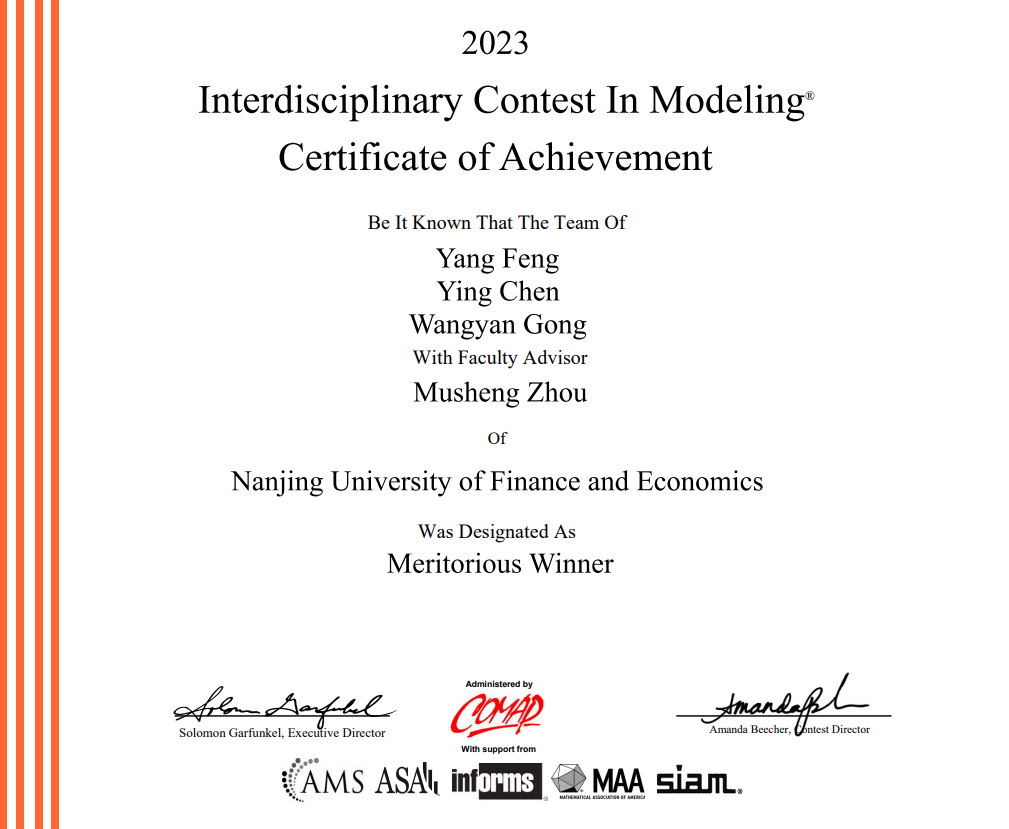 学子参加2023年美国大学生数学建模竞赛获奖名单: