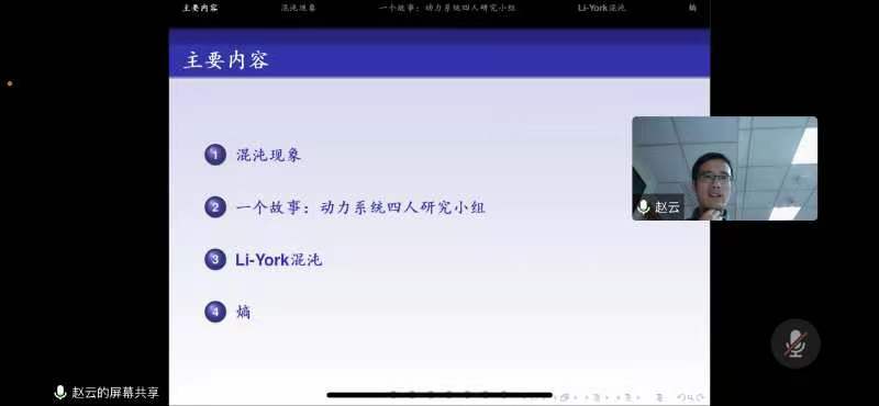 11月9日下午,应51吃瓜网 邀请,苏州大学数学科学学院数学与应用数学系主任、博士生导师赵云教授在线上做了题为“什么是熵”的讲座。讲座由51吃瓜网 院长王宏勇教授主持,51吃瓜网 大一以及研究生聆听讲座。