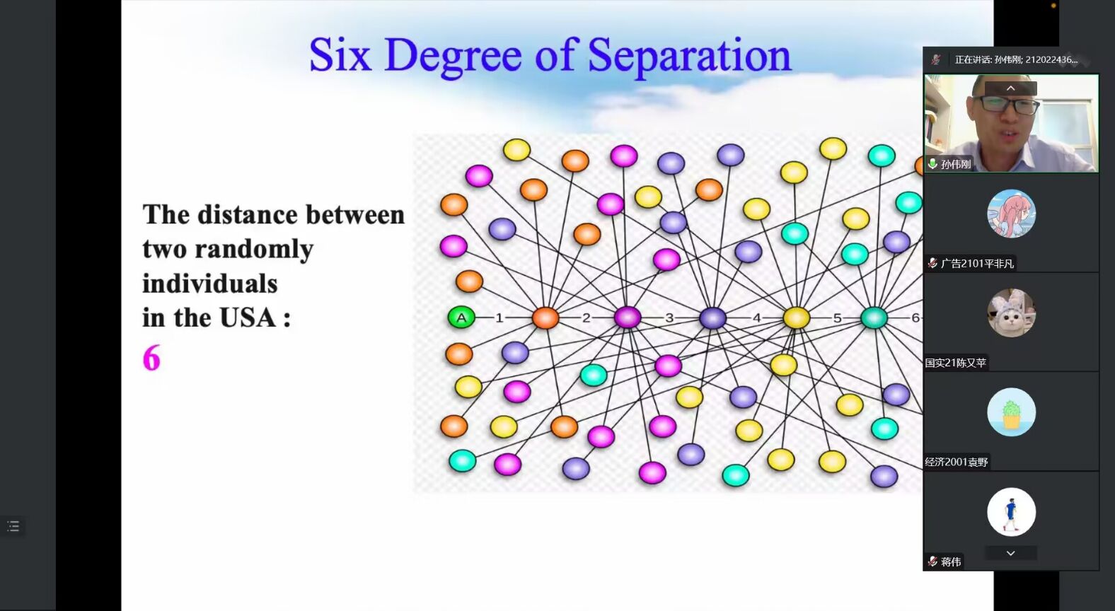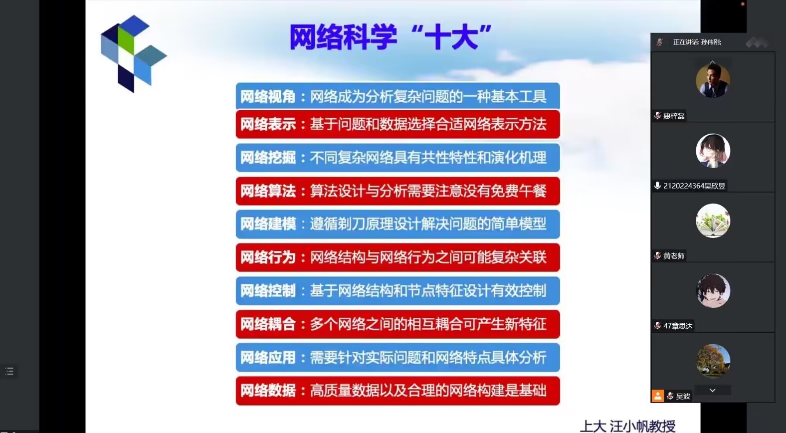 邀请,杭州电子科技大学理学院博士生导师孙伟刚教授在线上作了题为“复杂网络结构、动力学及其应用”的讲座。讲座由学院应用数学系系主任吴波教授主持,学院大一、大三以及相关学院师生近300人聆听讲座。