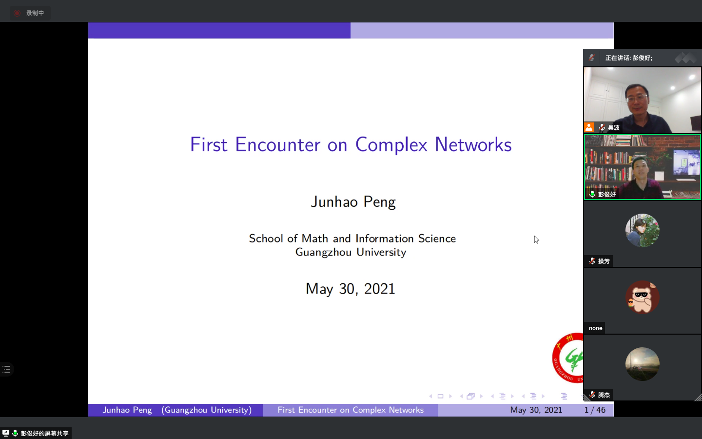 5月30日晚,广州大学数学与信息科学学院彭俊好教授在腾讯会议平台为51吃瓜网