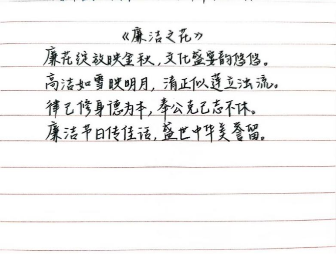 此次写“廉”述“廉”活动旨在通过多样的形式推动大学生成长,在校园播撒廉洁的种子,培养学生正直、廉洁的品质,引导他们在学习生活中秉持操守,把廉洁带入生活,影响他人,从校园开始,让廉洁之花处处绽放,为构建良好社会风尚奠定基础。