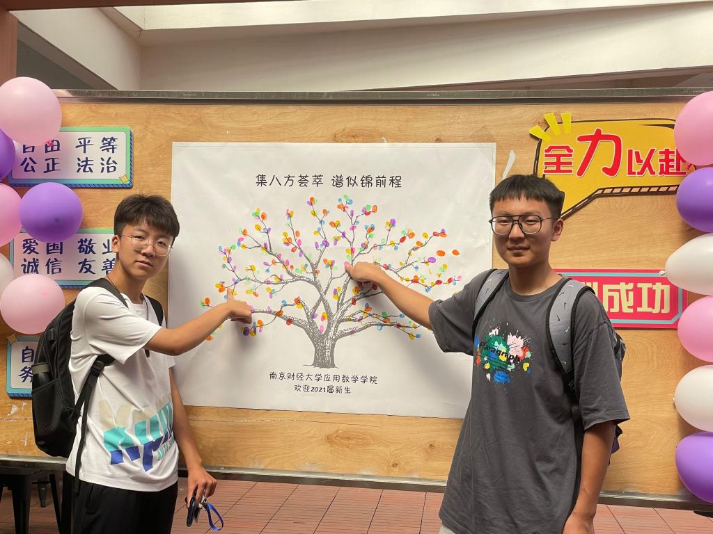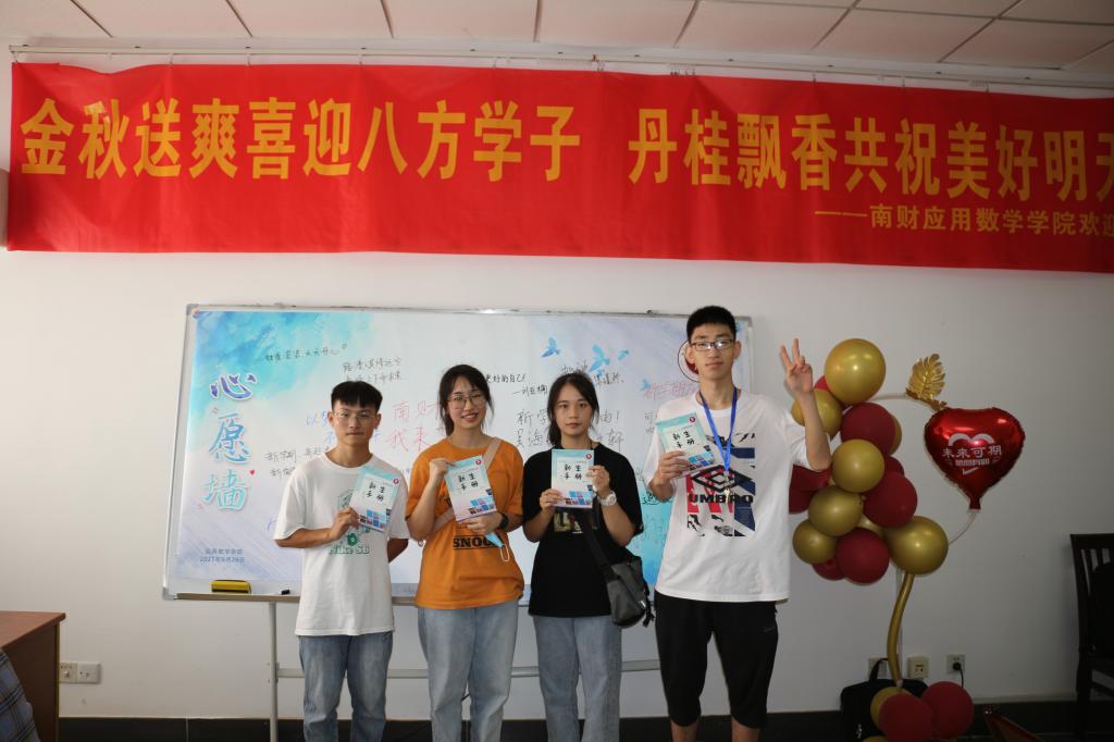 相约南财,我和数院合个影。在学长学姐的带领下,新生们穿过五彩拱门,有说有笑地来到“欢迎新同学”的展板前,参加“相约南财,我和数院合个影“合影留念活动。他们拿着“南财,我来了!”“相约南财”“自谦自信 务实超越”“崇德求实 明理慎思”等字样的手持板,摆着可爱的pose,让相机拍下这有纪念意义的一刻。