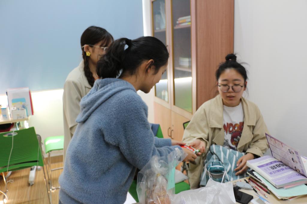 我们来到了考研教室,为学长学姐们贴上了考研倒计时,提醒他们胜利就在前方,不能松懈。我们还为学长学姐送去了咖啡、糖果,告诉他们在辛苦奋斗的同时也要注意身体。希望学姐学长们能调整好心态,积极备考。同时也要劳逸结合、放松心情,以最好的姿态迎接考研。我们也给学长学姐在桌子上贴上了爱心桌贴,让他们疲惫的备考生活多一些色彩。最后,我们和学长学姐们围坐在桌边谈心,交流学习经验。学长学姐们希望我们都能以奋斗成就青春年华,以汗水浇灌梦想的花朵。