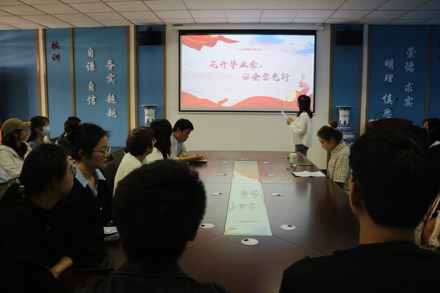在仙林校区德业楼508会议室开展 “花开毕业季,安全要先行” 安全主题教育活动。学院党委副书记孙晓飞、团委书记李攻明、辅导员卢艳梅和毕业生代表参加此次活动。