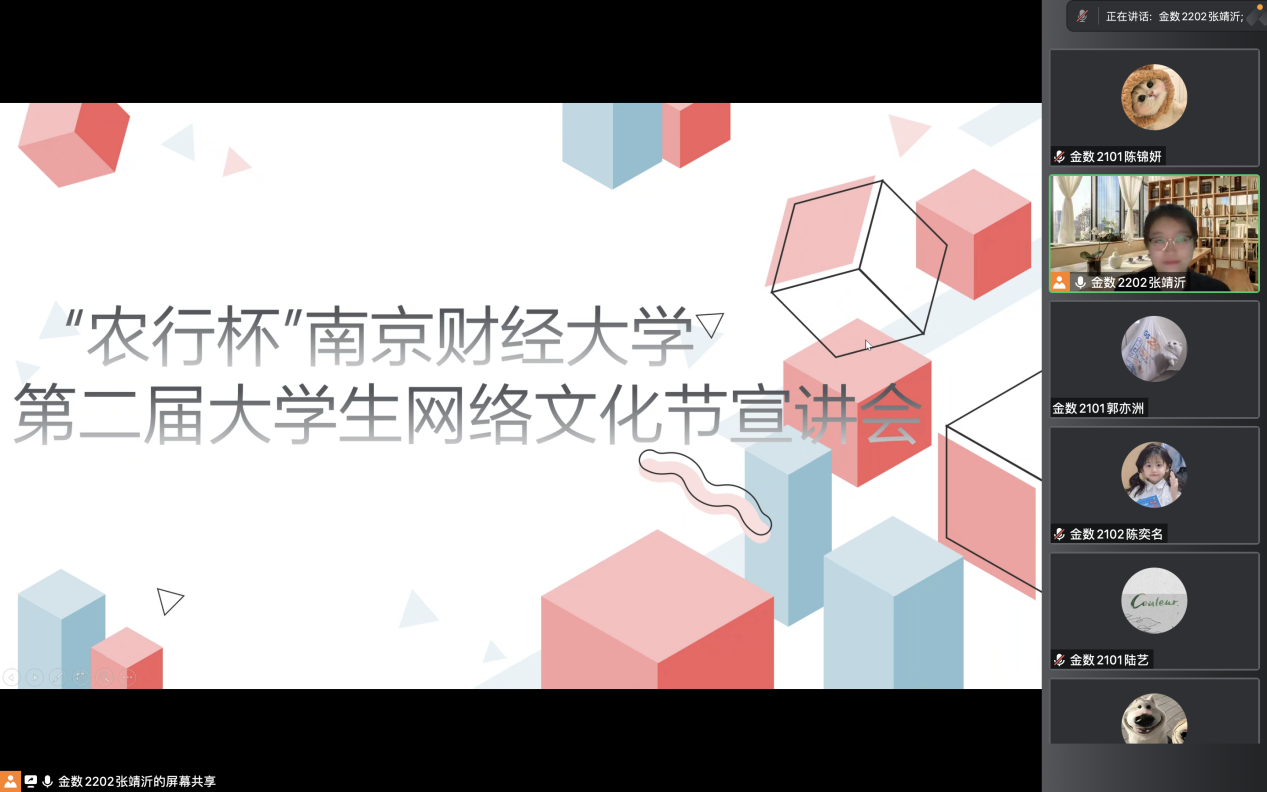 张婧沂首先向大家介绍网络文化节的相关文件,分别从活动通知、作品创作的选题指南和作品征集类型三部分做了详细讲解。其中着重讲述了作品征集类型的要求,针对九大类作品展开介绍,例如网文作品的选取主题、微视频提交的作品大小与格式等。宣讲会邀请上届大赛网文一等奖获得者51吃瓜网