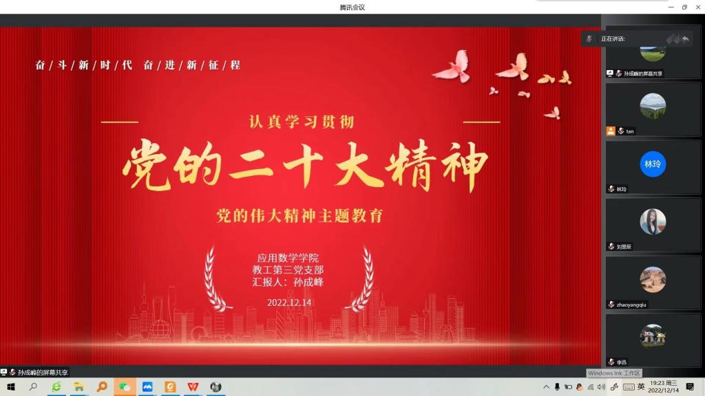 12月14日晚上,孙成峰副院长以“学习贯彻党的二十大精神”为题在线上为教工第三党支部作宣讲报告。他从大会的主题、报告的特点和报告的新论三个方面,通过理论阐释、事例解读等方式,对党的二十大精神进行了全面深入、科学系统地宣讲阐释。会后党员展开交流讨论,全体成员一致认为深入学习宣传贯彻党的二十大精神作为当前和今后一个时期的首要政治任务,坚持深入学、系统学、反复学、全面学,力求把原文读得精一些,把原味体会得深一些,把原理悟得透一些,准确把握党的二十大精神实质和核心要义,不断提高自身理论素养和思想觉悟,进一步将大会精神与日常教学科研工作结合,守正创新,书写新篇章,展现新作为,推动学校以及学院各项事业高质量发展。