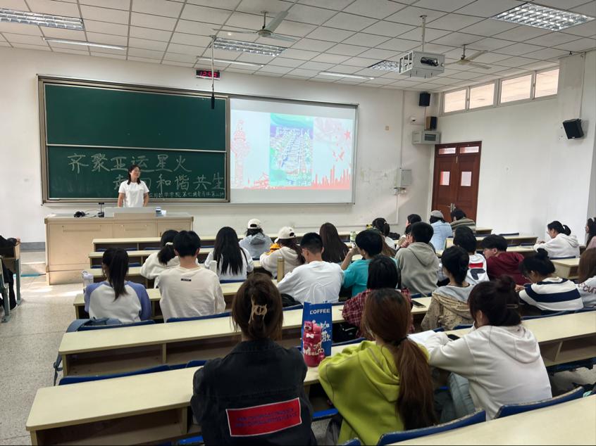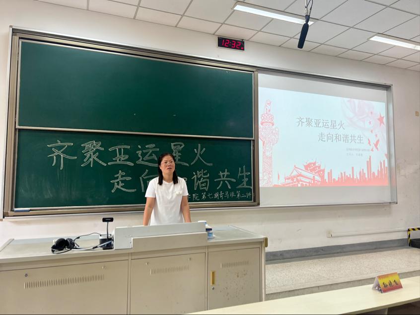 孙晓飞老师以中国国家跳水队运动员全红婵“一跳成名”的背后是“万炼成钢”的事例引入,为青马班学员讲解亚运精神的核心要义和内涵。她通过展示亚运会志愿者整齐划一的动作、机器狗辅助赛事的有趣瞬间、年轻播音员专业且热情洋溢的播报、背景音乐传递主旨的美好向学员们阐释了亚运会“绿色、智能、节俭、文明”的办赛理念,建议同学们要立高远之志,在面对困难和挑战时要勇往直前、坚持不懈、追求卓越,要将自己融入集体,学会与他人合作,共建美好地球村,走向和谐共生。
