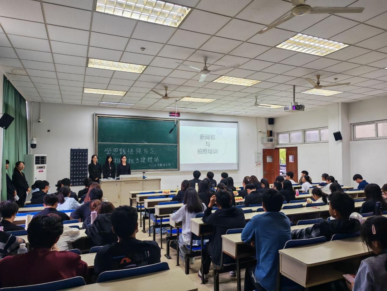 会上进行了新闻稿撰写与摄影技巧培训。院团委宣传部结合具体工作案例,详细讲授了活动摄影的构图、抓拍等实用技巧,以及新闻稿的写作要点、基本结构和常见问题,有效提升了团学骨干的宣传素养与业务能力。