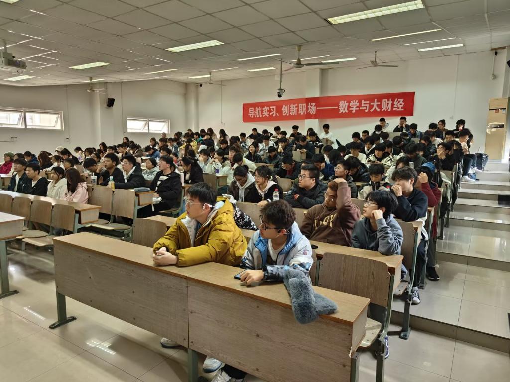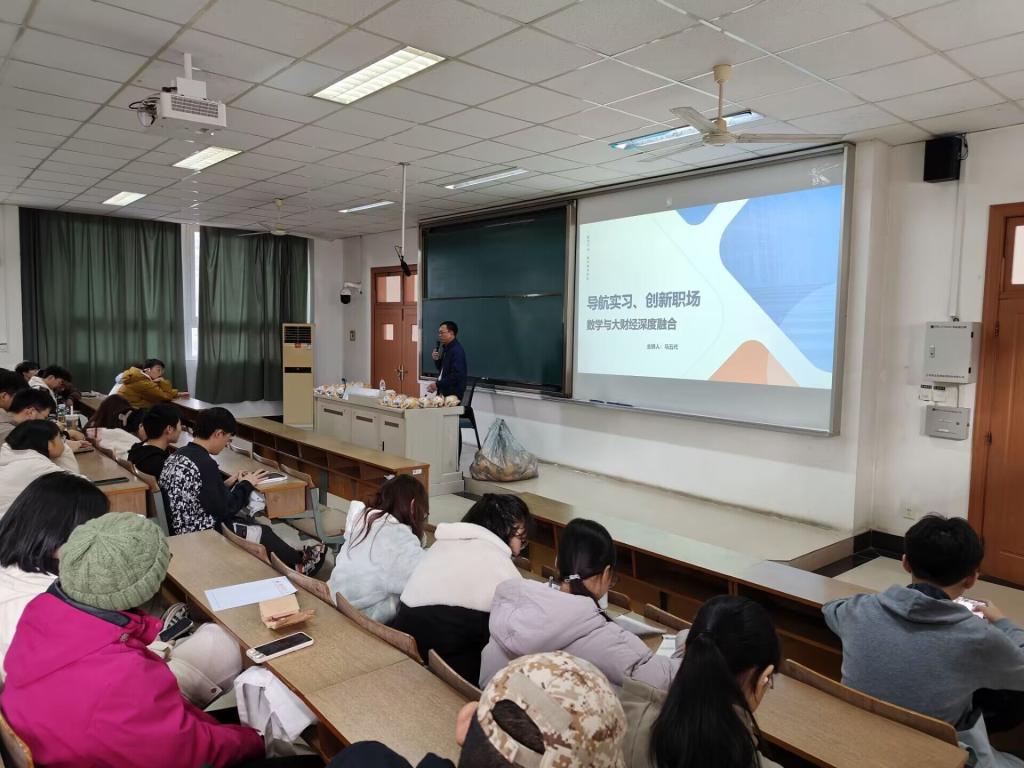 之后,马五代总经理作了题为“导航实习、创新职场——数学与大财经”专题讲座。他分享了自己毕业后就业面临的挑战以及15年坚守创业初心的行业经验,并以自己和同窗的大学生涯和发展轨迹告诉同学们,大学首要任务是学好专业,专业能力是核心竞争力,在此基础上,要注重实践经验的积累和沟通能力的培养。接着,他以自动驾驶和人工智能引发的失业危机等实例指出学习生涯和职业道路上并存的不同危机和机遇,强调认清自己、多学习多试错的重要性,并详细介绍了不同行业和领域的优势及挑战。最后,他再次强调,同学们应脚踏实地,拥有自己的想法和规划。
