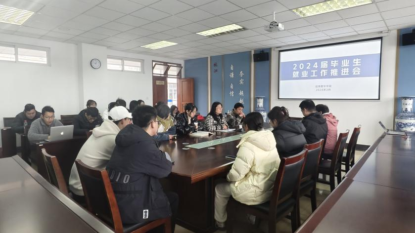 在仙林校区德业楼508会议室以线上线下相结合的方式召开2024届毕业生就业工作推进会。学院学工老师、全体毕业班学生参加会议。会议由院党委副书记孙晓飞主持。