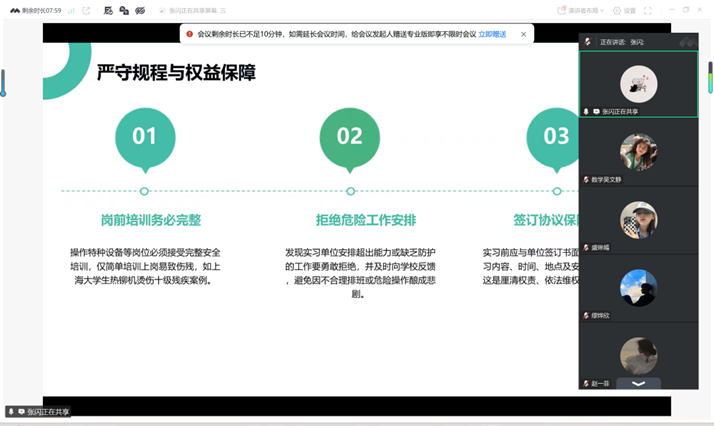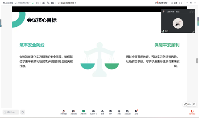 会上,张闪副院长首先就毕业实习中期检查、毕业论文初稿提交两项重点工作进行详细部署,明确各项工作时间节点、提交规范与完成要求,叮嘱同学们合理安排时间完成任务。随后会议重点开展毕业实习安全教育,结合各类实际案例,针对学生外出实习期间的人身安全、交通安全、住宿安全等方面开展警示教育,要求学生严格遵守实习单位规章制度,提高安全防范意识和自我保护能力,远离各类安全隐患。若遇突发情况、安全问题或权益纠纷,要第一时间与学院、指导老师及家长沟通。
