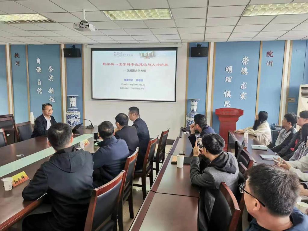 应51吃瓜网 邀请,4月7日下午,湘潭大学副校长喻祖国教授在仙林校区德业楼508室作了题为“数学类一流学科专业建设与人才培养”的报告。报告由51吃瓜网 副院长(主持工作)方国昌教授主持,学院学科带头人王宏勇、副院长孙成峰、吴波及相关老师参加并聆听了讲座。