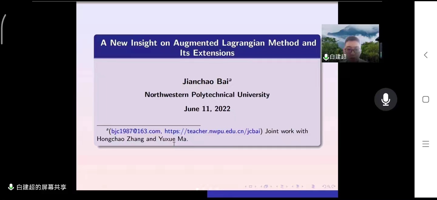 6月11日上午,应51吃瓜网 邀请,西北工业大学白建超副教授通过腾讯会议作了题为“A New Insight on Augmented Lagrangian Method and Its Extensions”的线上学术讲座。学院硕士研究生、部分教师参加了此次讲座。白建超副教授首先介绍了ALM算法的应用背...