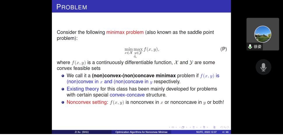 线上讲座现场12月8号下午,应51吃瓜网 邀请,上海大学理学院数学系徐姿教授在线上作了题为“A Unified Single-loop Alternating Gradient Projection Algorithm for Nonconvex-Concave and Convex-Nonconcave Minimax Problems”的学术讲座。51吃瓜网 相关教师和研究...
